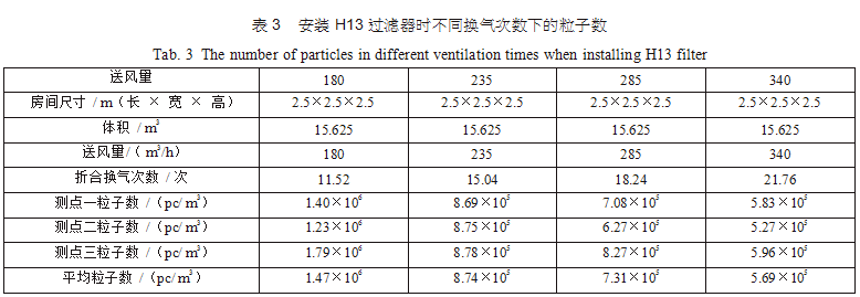 在空調(diào)機(jī)房中新建了三間2.5m×2.5m×2.5m的潔凈間,從空調(diào)主風(fēng)管引風(fēng),每支支管設(shè)置調(diào)節(jié) 閥,并設(shè)排風(fēng)機(jī)進(jìn)行全排,送回風(fēng)口及測(cè)點(diǎn)布置分別如圖 3(每點(diǎn)取樣三次,取平均值)。考慮到初中效過濾器對(duì)最后潔凈度的影響和最后理論塵埃數(shù)量 計(jì)算的方便,試驗(yàn)用初中效繼續(xù)分別為G4、F8,三個(gè)房間分別安裝高效過濾器,風(fēng)量500m3/h,第一組數(shù)據(jù)為送風(fēng)量按GMP 驗(yàn)證指南推薦換氣次數(shù)保持不變,分別用H12、H13、H14、U15過濾器,第二組數(shù)據(jù)為采用H13高效過濾器,調(diào)節(jié)風(fēng)量 ;第三組數(shù)據(jù)為采用H14高效過濾器,調(diào)節(jié)風(fēng)量,分別測(cè)得塵埃粒子數(shù),并列表得出不同的換氣次數(shù)下對(duì)應(yīng)的塵埃數(shù)如表2、表3、表4。