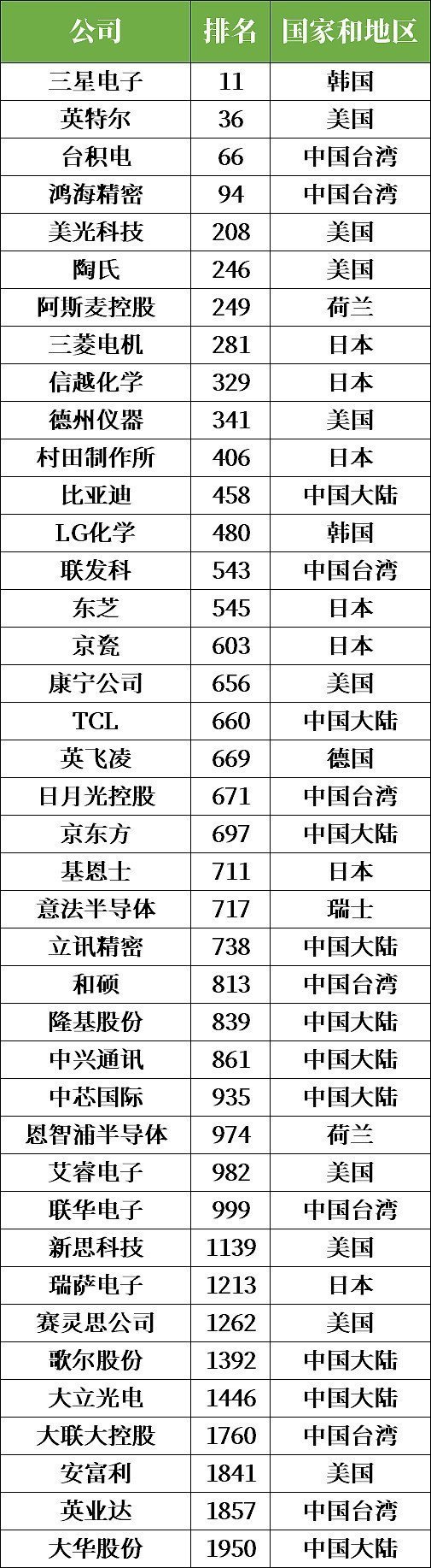 據(jù)統(tǒng)計,2000強(qiáng)榜單中有41家半導(dǎo)體相關(guān)公司,其中包括中國大陸企業(yè)10家,中國臺灣企業(yè)9家。