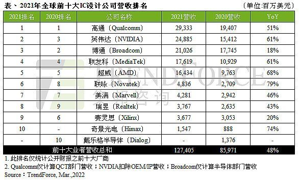 據(jù)TrendForce集邦咨詢研究顯示,2021年由于各類終端應(yīng)用需求強(qiáng)勁,導(dǎo)致晶圓缺貨,全球IC產(chǎn)業(yè)嚴(yán)重供不應(yīng)求,連帶使芯片價格上漲,拉抬2021年全球前十大IC設(shè)計業(yè)者營收至1,274億美元,年增48%。